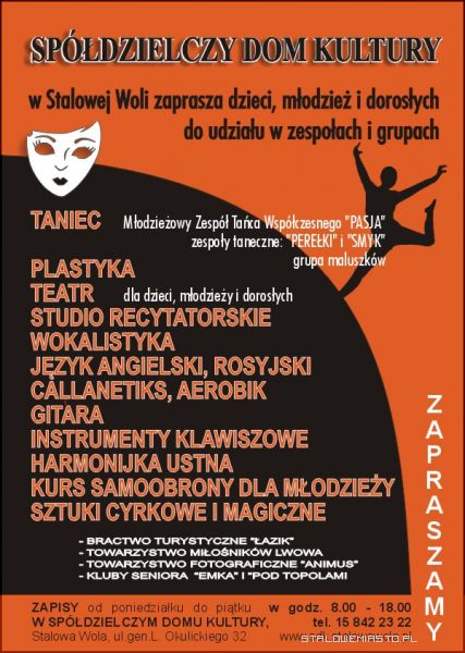- Spółdzielczy Dom Kultury, mimo ciasnej bazy i małych możliwości lokalowych, wprowadza 6 nowych form, więc oprócz tych już istniejących takich jak: taniec, plastyka, teatr, studio recytatorskie, wokalistyka, język angielski, instrumenty klawiszowe, gitara, callanetics, aerobik, zapraszamy na nowe: naukę gry na harmonijce ustnej, kurs samoobrony dla młodzieży i sztuki cyrkowej magicznej, warsztaty haftu, lektorat języka rosyjskiego. Obserwujemy w ciągu ostatnich dni duże zainteresowanie małych dzieci formami tanecznymi, więc być może, a wiele na to wskazuje, wprowadzimy Zumbe Kids dla maluszków– mówiła w rozmowie z dziennikarzem Portalu StaloweMiasto.pl Bogusława Herdzik, dyrektor Spółdzielczego Domu Kultury.Od 11 września odbywać się będą pierwsze spotkania, choć zapisać się będzie można jeszcze później (do końca września), tak by móc dopasować swój kalendarz do zajęć.