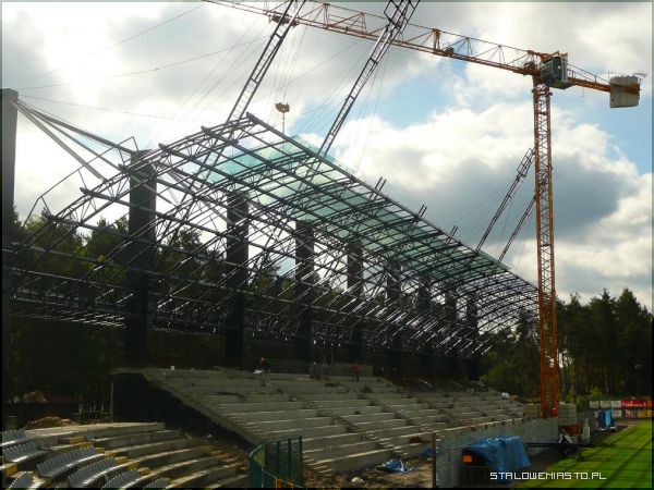 Wykonawcy od konstrukcji stalowej pracowali 7 dni w tygodniu, by wyrobić się w terminach i przygotować konstrukcje pod szkło, teraz prace będą trwały już 5 dni w tygodniu. Jak usłyszeliśmy, na budowie roboty związane z montażem szyb idą zgodnie z planem. Do wtorku ma być zamontowana połowa szyb. W poniedziałek ma przyjść kolejna i ostatnia dostawa. 8-9 października ma zakończyć się montaż pierwszej połowy trybuny. Szkło „na gotowe” wraz z sylikonowaniem będzie zgłoszone do odbioru 19 października. Do 25 października mają być już zamontowane krzesełka. Blacha na dach ma przyjechać w poniedziałek, bądź we wtorek, wykonawca zapewnia, że do końca października wyrobi się z jej położeniem.