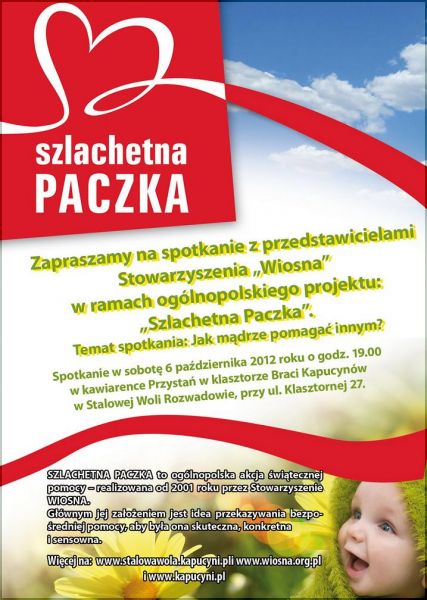 Temat: Jak mądrze pomagać innym? Spotkanie w sobotę 6 października 2012 roku o godz. 19.00 w kawiarence Przystań w klasztorze Braci Kapucynów w Stalowej Woli Rozwadowie, przy ul. Klasztornej 27. SZLACHETNA PACZKA to ogólnopolska akcja świątecznej pomocy realizowana od 2001 roku przez Stowarzyszenie WIOSNA. Głównym jej założeniem jest idea przekazywania bezpośredniej pomocy, aby była ona skuteczna, konkretna i sensowna. Więcej na: www.stalowawola.kapucyni.pl i www.wiosna.org.pl i www.kapucyni.pl