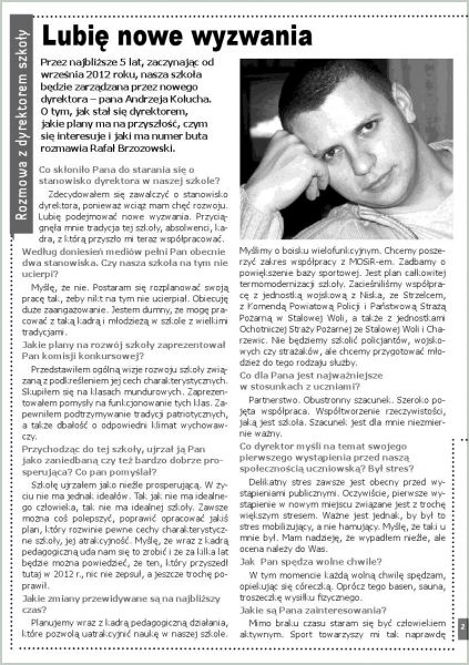 W Zespole Szkół Ponadgimnazjalnych nr 1 im. gen. Wł. Sikorskiego w Stalowej Woli działa kółko dziennikarskie, które regularnie wydaje gazetkę szkolną „Sikorski”. Jego opiekunem jest Katarzyna Walerowicz. W październikowym wydaniu ukazał się ciekawy artykuł, a w nim rozmowa z nowym dyrektorem szkoły Andrzejem Koluchem. Artykuł nosi tytuł: „Lubię nowe wyzwania”. Jego autorem jest Rafał Brzozowski…
