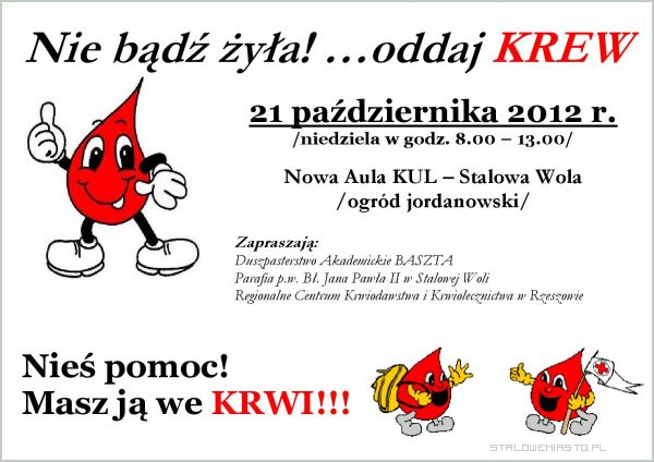Duszpasterstwo Akademickie BASZTA, parafia p.w. Bł. Jana Pawła w Stalowej Woli, Regionalne Centrum Krwiodawstwa i Krwiolecznictwa w Rzeszowie zachęcają do oddania krwi w najbliższą niedzielę. Od godz. 8.00 do 13.00 w Ogródku Jordanowskim (aula Katolickiego Uniwersytetu Lubelskiego Jana Pawła II w Stalowej Woli, ul. Ofiar Katynia 6).