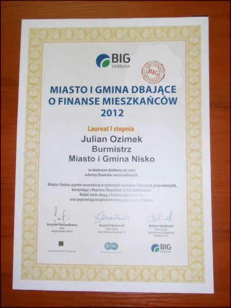 Nisko otrzymało wyróżnienie I stopnia za skuteczne działanie na rzecz ochrony finansów samorządowych. Za szczególną dbałość o finanse został uhonorowany burmistrz J. Ozimek.