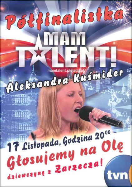 Łzy, wzruszenie, czysta przyjemność słuchaniaDzięki jej występowi w programie „Mam Talent” poznała ją cała Polska. Nie tylko oczarowała jury i publiczność, która na stojąco oklaskiwała jej występ, ale również sprawiła, że Małgorzata Foremniak ze wzruszenia rozpłakała się przed kamerami, a to widok niecodzienny. Zazwyczaj jurorka domaga się „krwi” i „ostrego show”. Piosenka zaśpiewana przez Aleksandrę przebiła się przez jej twardą powłokę i wzruszyła ją do łez. Ola jednogłośną decyzją jurorów przeszła do kolejnego etapu programu „Mam Talent”.