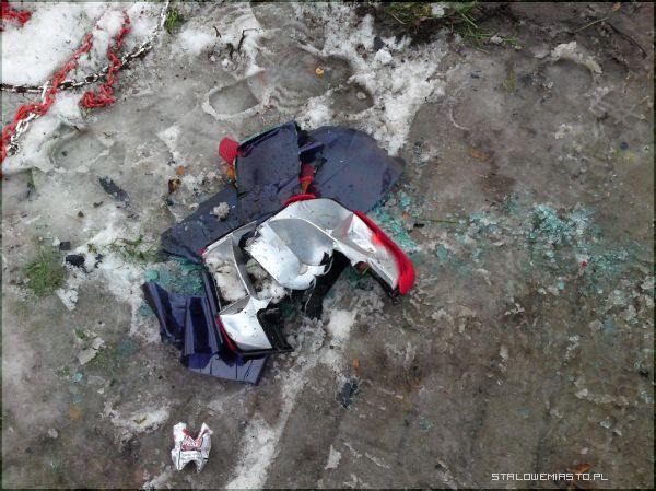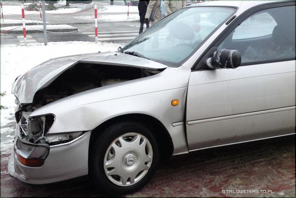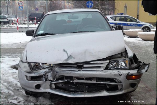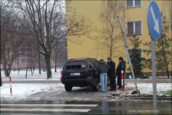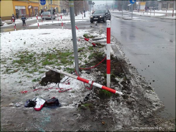 - Kierowca nie dał rady wyhamować i uderzył jeepa, który się przed nim zatrzymał. Później samochód skosił kilka pachołów oraz przekrzywił znak stojący przy przejściu. Co się w sumie dziwić, na ulicy plucha, ciapa, a oczywiście temu co nie odśnieżył za to nic nie zrobią. Niech to jeszcze zamarznie przez noc i takich wypadków, kolizji będzie mnóstwo – mówi świadek zdarzenia.