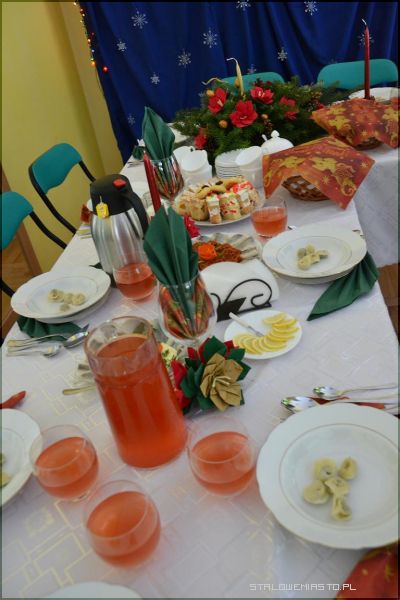 Na wigilijnym stole pojawiły się tradycyjne świąteczne dania. Dzieci z ogromną przyjemnością zajadały się uszkami, barszczykiem czy rybą. Wiele radości sprawiły również inne smakołyki. Ze względu na to, że właściwie wszystkie maluchy nie lubią kompotu z suszu, specjalnie dla nich został przygotowany kompot z suszonych jabłek oraz truskawek.