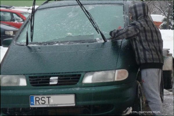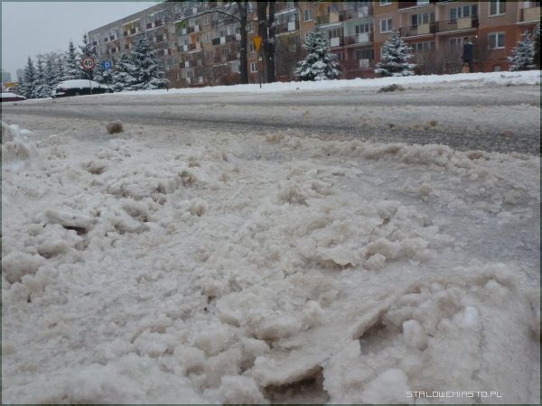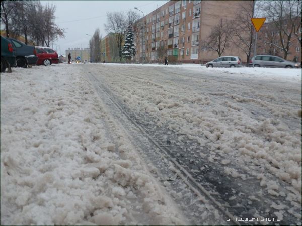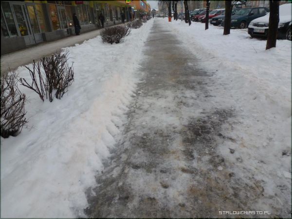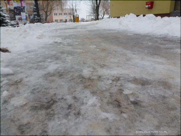 - Czyszczenie samochodu zajęło mi jakieś pół godziny, syn mi pomagał to trochę szybciej poszło. Wracając z pracy przejechałem prawie całą Stalową Wolę. Warunki na części dróg były średnie, zdarzały się prawie czarne drogi, bardzo ciężko jest wyjechać spod bloku, przejazd po mniej ruchliwych uliczkach nie należy też do łatwych. Jeśli ktoś nie ma kompletu opon zimowych, to mu współczuję, bo ja w taką drogę to bym się nie wybrał. Lepiej pojechać autobusem - ocenia kierowca ze Stalowej Woli. Na chodniku ślizgawkaChodniki należące do miasta były posypane już rano, piesi więc na te drogi nie narzekali. Od świtu w miasto wyruszyły piaskarki i spychacze. Gdzieniegdzie, np. w okolicy Urzędu Miasta z łopatami wyruszyli ludzie. Także osoby na co dzień zajmujące się sprzątaniem wokół bloków zabrały się za odśnieżanie i sypanie chodników piaskiem. Najgorzej było przed blokami wspólnot mieszkaniowych. Tam nie zawsze było odśnieżone i posypane. Zresztą tam, gdzie przed chwilą ktoś zadbał o bezpieczeństwo pieszych, tam padający deszcz, który zamarzał w kilka chwil, zrobił swoje.