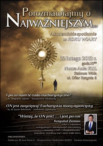 - rola i znaczenie cudów eucharystycznych w życiu Kościoła, - moc i rola Eucharystii w posłudze egzorcysty – słowo ks. Jacka Beksińskiego egzorcysty naszej diecezji - słowo - świadectwo gościa specjalnego Krzysztofa Ziemca – jednego z najbardziej wiarygodnych i obiektywnych dziennikarzy telewizyjnych i radiowych, związanego z TVP1 i "Wiadomościami", a prywatnie szczęśliwego męża i ojca trójki dzieci.