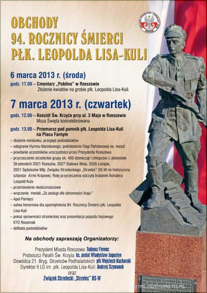 Związek Strzelecki „STRZELEC” Organizacja Społeczno- Wychowawcza Jednostka Strzelecka 2027 im. gen. bryg. Aleksandra Litwinowicza w Stalowej Woli weźmie udział w obchodach 94 Rocznicy Śmierci płk. Leopolda Lisa-Kuli, na które zaprasza mieszkańców Stalowej Woli.