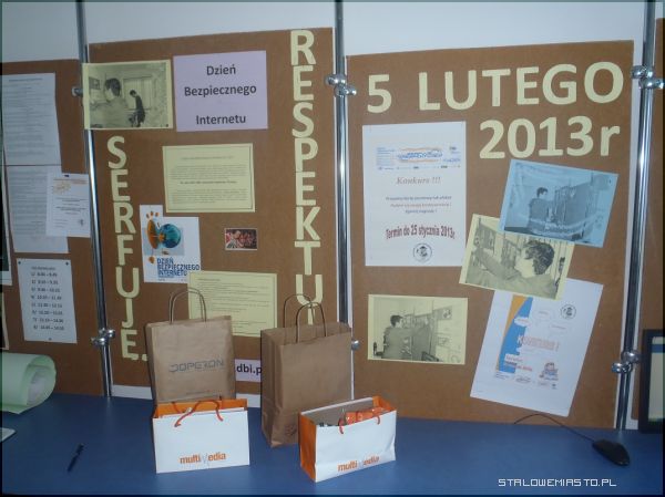 W dniach 28 I - 5 III w ramach ogólnoświatowej kampanii Dzień Bezpiecznego Internetu, uczniowie klasy I brali udział w warsztatach na temat bezpiecznego dostępu do zasobów internetowych oraz wykorzystywania nowoczesnych technologii w różnych aspektach życia codziennego. W ramach szkolnych obchodów przygotowano materiały informacyjne dotyczące zamierzonych działań na terenie szkoły, które zostały zamieszczone na stronie internetowej, przygotowano gazetkę w pracowni komputerowej nt. prawa autorskiego, zasad netykiety oraz wystawę fotografii z kampanii DBI, prowadzonej w SLO w 2012 r. Koordynator szkolnych obchodów DBI 2013, nauczycielka informatyki Monika Bis, przeprowadziła także dla uczniów kurs on-line „W sieci” na platformie edukacyjnej FDN.