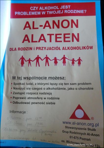 Spotkania/Informacje: Grupa Al-Anon „ Metamorfoza” Dom Parafialny przy kościele Opatrzności Bożej (salka na parterze) ul.Poniatowskiego 41 poniedziałek godz: 17:00 Grupa Alateen „ Płomyczek Nadziei” Dom Parafialny przy kościele Opatrzności Bożej (salka na parterze) ul.Poniatowskiego 41 poniedziałek godz: 16:00 Dla dzieci i młodzieży od 9 do 21 roku życia Telefon informacyjny: 518925592 www.al-anon.org.pl