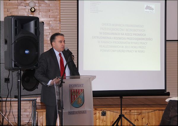 Dyrektor Powiatowego Urzędu Pracy w Nisku - Piotr Rutyna przedstawił „Oferty wsparcia finansowego przedsiębiorców i bezrobotnych w działaniach na rzecz promocji zatrudnienia i rozwoju przedsiębiorczości w ramach programów rynku pracy realizowanych w 2013 roku przez Powiatowy Urząd Pracy w Nisku”.