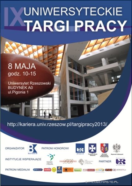 Biuro Karier Uniwersytetu Rzeszowskiego zaprasza na IX Uniwersyteckie Targi Pracy, które odbędą się 8 maja 2013 r. w godzinach od 10.00 – 15.00 w budynku głównym Uniwersytetu Rzeszowskiego. Patronat honorowy nad tym wydarzeniem objęli: rektor Uniwersytetu Rzeszowskiego, Wojewoda Podkarpacki, Marszałek Województwa Podkarpackiego oraz Prezydent Miasta Rzeszowa. Targi ponadto wspierają Wojewódzki Urząd Pracy, Izba Przemysłowo Handlowa, Podkarpacki Klub Biznesu.