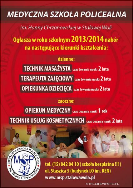 Dyrekcja, Nauczyciele i Słuchacze wszystkich kierunków kształcenia Medycznej Szkoły Policealnej im. Hanny Chrzanowskiej w Stalowej Woli ul. Staszica 5 zapraszają na dzień otarty pracowni szkolnych, który odbędzie się w piątek 26 kwietnia.
