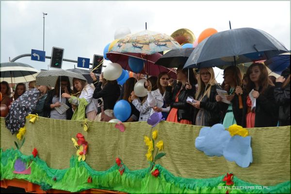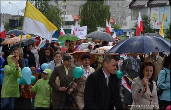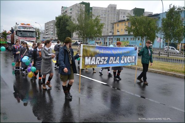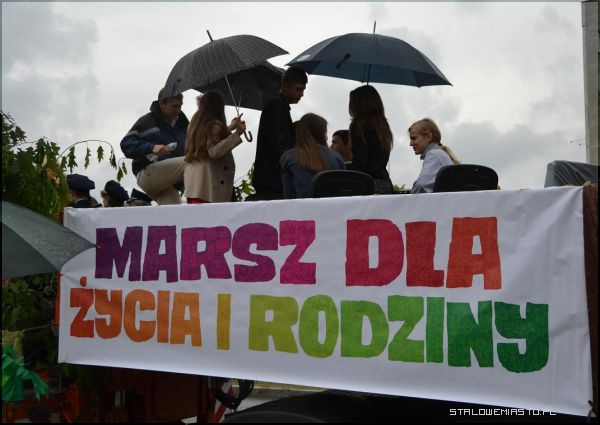 Zaraz po mszy św. mieszkańcy naszego miasta, którzy zdecydowali się na udział w marszu, mimo złej pogody przeszli ulicami Stalowej Woli. Start: bazylika, meta: rozwadowski klasztor. W międzyczasie rozdawane były flagi, daszki dla dzieci, baloniki oraz śpiewniki. Początkowo planowano, że tak jak w ubiegłym roku, za banerem „Marsz dla Życia i Rodziny” pójdą mażoretki z Niżańskiego Centrum Kultury „Sokół”, jednak z uwagi na złe warunki atmosferyczne, tak się nie stało. Orkiestra z Miejskiego Domu Kultury oraz uczniowie katolickiego gimnazjum i liceum jechali na platformie tuż za transparentem. Nie zabrakło również harcerzy. Zaraz za nimi podążała reszta uczestników. Marsz w tym roku był bardzo kolorowy, nie tylko ze względu na balony i daszki, ale także deszczowa pogoda sprawiła, że różnobarwne kolory parasoli dodały mu fantazji. Niesiono także transparenty: „ Domowy kościół broni życia i rodziny”, „Miłość, Życie i Rodzina to najlepsza jest nowina!”.