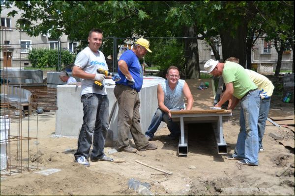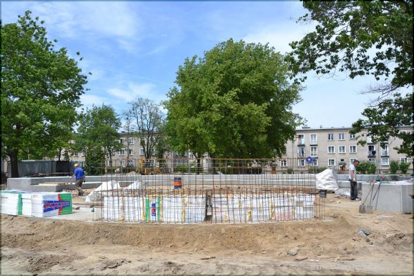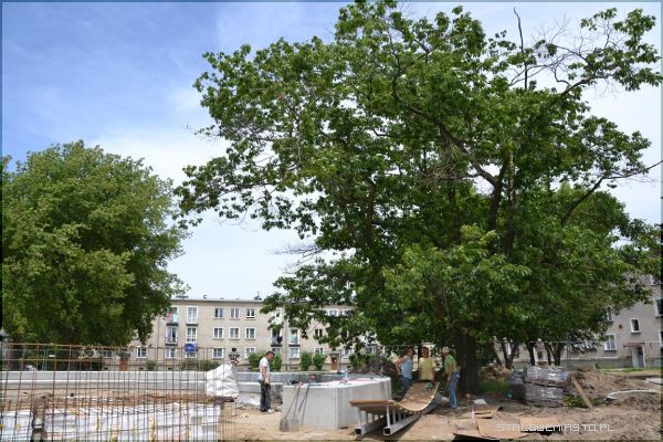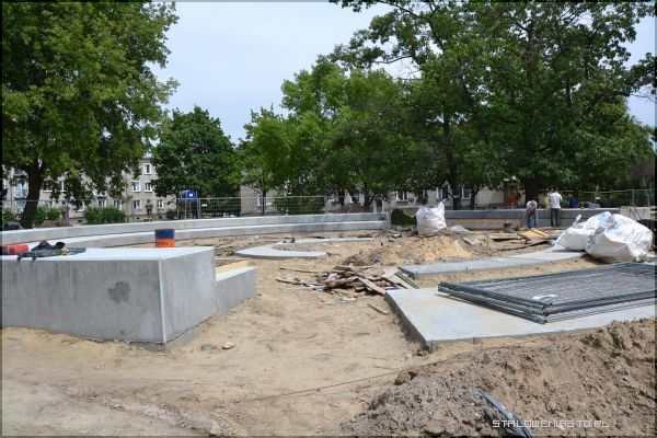 Najbardziej zaawansowane są prace przy amfiteatrze, który jest już niemal w połowie gotowy. Jak można zobaczyć na zdjęciach, dąb kanadyjski stoi na swoim miejscu, amfiteatr natomiast został nieco przesunięty. Teraz wystarczy usunięcie części gałęzi. Obok amfiteatru zostały zainstalowane urządzenia dla dzieci i seniorów. Siłownia na powietrzu robi duże wrażenie, każde z urządzeń jest opisane, w jaki sposób z niego można korzystać. Można również przeczytać jakie mięśnie ćwiczymy korzystając z danego urządzenia np. w przypadku „wioślarza” budujemy muskulaturę obręczy barkowej, grzbietu, ramion i nóg. Urządzenie poprawia ogólną kondycję organizmu, uelastycznia odcinek lędźwiowy kręgosłupa. Aby korzystać z niego należy usiąść na siodełku, złapać oburącz uchwyt i wykonywać ruch od siebie i do siebie. Z tego urządzenia, podobnie jak i innych może korzystać już 10- letnie dziecko pod opieką osoby dorosłej, bądź osoby powyżej 14 roku życia, która waży maksymalnie 120 kg. W zakresie placu zabaw i siłowni do wykonania zostało jeszcze tylko położenia bezpiecznej nawierzchni (w przyszłym tygodniu).