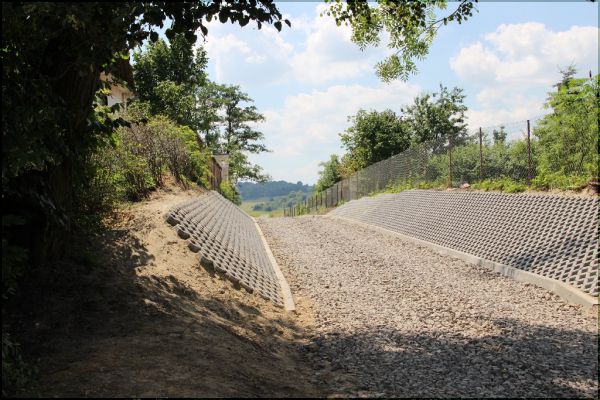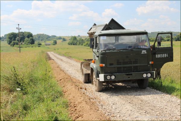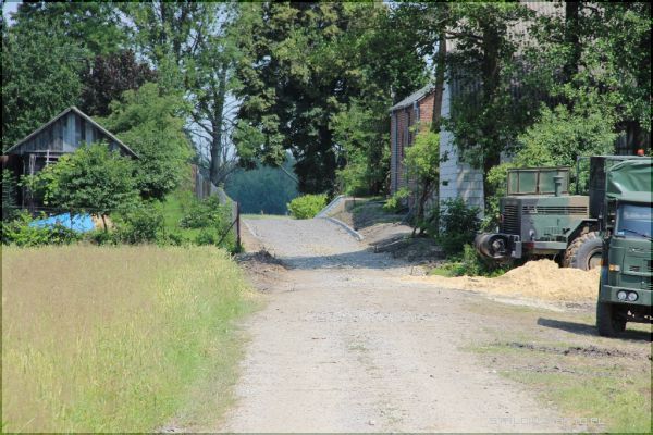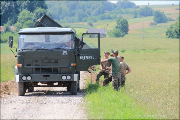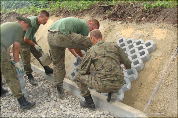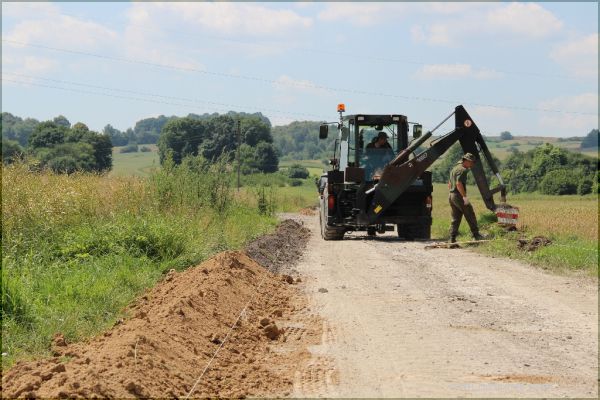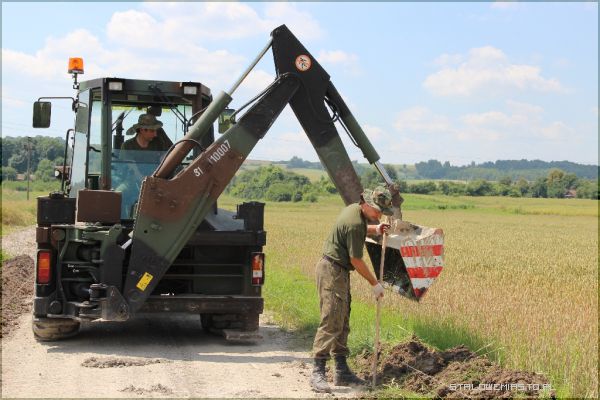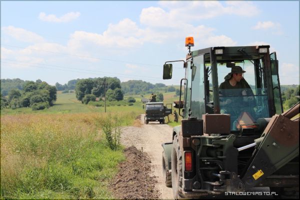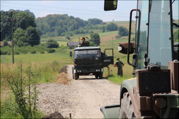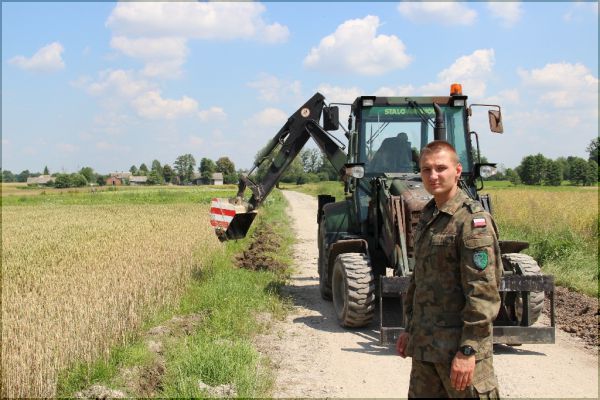 - Początki były ciężkie. Istniejąca polna droga była zarośnięta i w złym stanie, trzeba było wykarczować kilka drzew i konarów, wykopać korzenie wchodzące w koronę drogi, a także wykonać wykop – dodaje porucznik.Innym problemem z którym borykali się żołnierze była nie do końca przyjazna aura i podmokły teren. Padający prawie przez dwa tygodnie czerwca deszcz bardzo utrudniał prace, a teren był praktycznie nieprzejezdny. Saperzy są jednak dobrej myśli i deklarują że zadanie wykonają w terminie. Obecnie początkiem lipca są już na półmetku. Wykonany został najtrudniejszy odcinek w wykopie oraz przepust drogowy. Obecnie wykonywane jest wzmocnienie obrzeży, tak aby nawierzchnia nie była podmywana przez wodę. W części drogi, który znajduje się w wykopie ułożono tez krawężniki i wzmocniono skarpy. Planowany termin zakończenia prac to ostatnia dekada lipca 2013 roku.