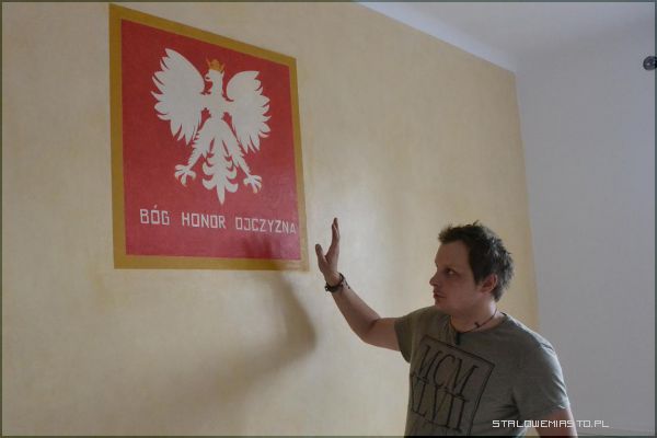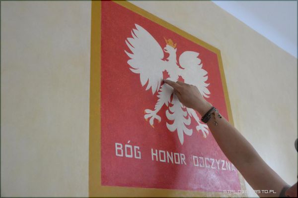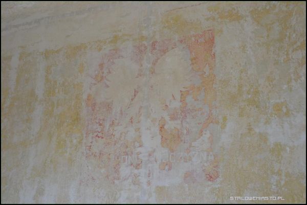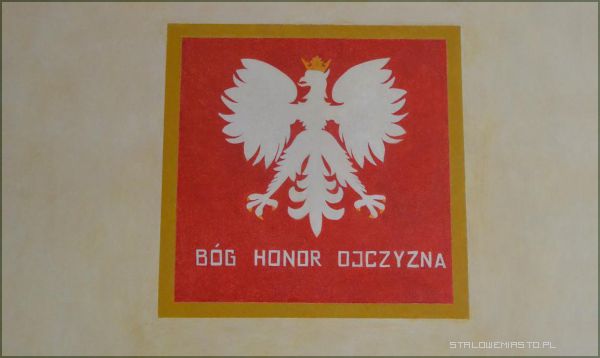 Historia obiektuMalowidło przedstawiające godło Polski – Orła Białego, znajduje się na I piętrze budynku, w którym obecnie mieści się Urząd Miasta. Zostało odkryte pod koniec maja 2013 roku przez pracowników remontujących pomieszczenie. Przy usuwaniu warstw starej farby, na jednej ze ścian ukazał się wizerunek polskiego godła – Orła Białego z podpisem” (…) Honor, Ojczyzna”, gdzie słowo „Bóg” zostało zdrapane.