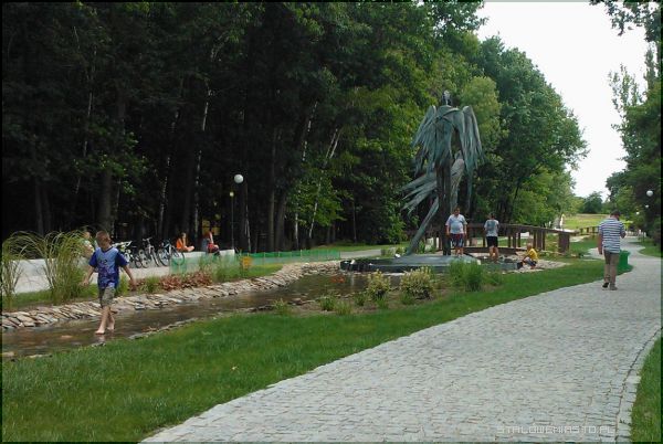- Obiekt jest monitorowany, jeżeli będą stwierdzone naruszenia tych przepisów, będzie informowana policja i będzie to podstawą do ukarania mandatem. Ja już nie mówię o tym, że wchodzenie na ten pomnik stwarza niebezpieczeństwo dla dzieciaków – mówi Sylwester Piechota, naczelnik Wydziału Gospodarki Komunalnej w Stalowej Woli.Środki jakie zastosowało miasto okazały się całkiem skuteczne, bo teraz coraz rzadziej pojawiają się tutaj rodzice czy opiekunki z dziećmi, które przychodzą z myślą o tym by się popluskać. Zdarzenia te mają charakter raczej incydentalny. Jedno z nich zaobserwowaliśmy w poniedziałek 22 lipca. Czwórka dzieciaków, prawdopodobnie z nudów, postanowiła „przyjrzeć się nieco bliżej” fontannie. Chłopcy weszli do misy, spacerowali wokół niej, opierali się o rzeźbę „Dedala i Ikara”, chlapali wodą, po prostu w najlepsze bawili nie zwracając uwagi na informujące o zakazie kąpieli tabliczki. Jeden z nich spacerował sobie wzdłuż cieku. Siedzący obok na betonowych klockach dorośli nie reagowali na wyczyny dzieciaków. Po krótkim czasie pojawiła się ochrona, która przegoniła kąpiących się, informując ich o tym, że ich zachowanie jest nie właściwe oraz że plac zabaw przeznaczony dla nich znajduje się kilka metrów dalej.
