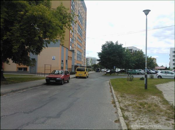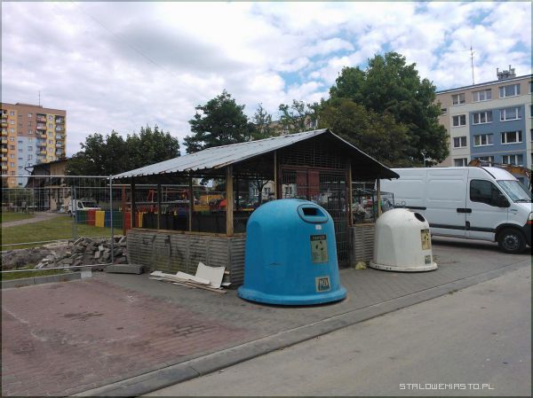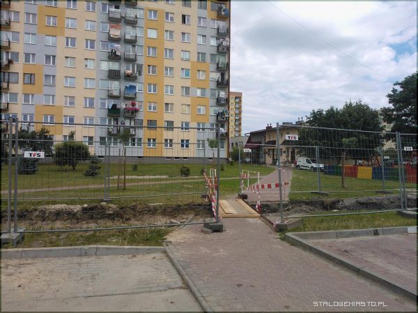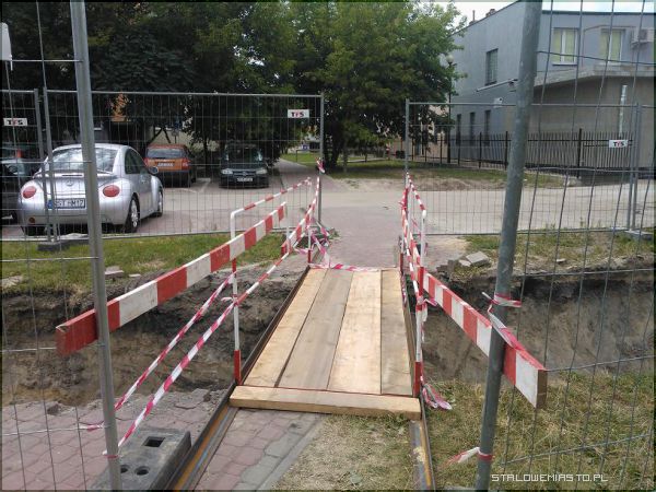 Zmiany, które niesie za sobą ustawa o utrzymaniu czystości i porządku w gminach oraz związana z tym konieczność segregacji odpadów, zmusiły Administrację Osiedlową Spółdzielni Mieszkaniowej do zamknięcia zsypu, jaki do tej pory funkcjonował w wieżowcu, w którym mieszkają. W związku z powyższym od 15 lipca br. miejscem składowania odpadów dla mieszkańców jest altana śmietnikowa znajdująca się przy innym bloku. Klucze do niej lokatorzy wieżowca zastali w skrzynkach pocztowych, zsyp natomiast został zamknięty. Również niewidome małżeństwo musi dostosować się, podobnie jak sąsiedzi, do tego zarządzenia. Aby któryś z małżonków mógł teraz wyrzucić śmieci, musi pokonać nierówny chodnik. Na swojej drodze spotyka również prowizoryczny, trzęsący się mostek zbity z desek, którym trzeba przejść, by dostać się na parking samochodowy. Na nim to właśnie stoi śmietnik. Mostek ułożony został w taki sposób, że nie znajduje się wprost na chodniku, lecz jest postawiony obok (zob. zdjęcia). Dla przeciętnej osoby nie jest to żaden problem, jednak dla niewidomych już tak. Po zejściu z mostka należy dodatkowo zachować ostrożność, gdyż wchodzimy bezpośrednio na parking, gdzie co rusz przejeżdża jakieś auto. Jest to najkrótsza droga do śmietnika. Małżonkowie teoretycznie mogliby skorzystać z innych pergoli, jednak droga do dwóch najbliżej położonych, dla osób niewidomych jest niebezpieczna. Aby dostać się do pierwszego z nich należy przejść wzdłuż bloku, następnie skręcić w lewo, przeciąć drogę osiedlową, która jest dość ruchliwa i dopiero dotrzeć do śmietnika. Droga do kolejnej pergoli jest podobnej długości, również należy przejść wzdłuż bloku, poczym przedostać się przez ruchliwą drogę przejściem dla pieszych, które nie ma sygnalizacji świetlej. Od ulicy do pergoli, które znajdują się na parkingu samochodowym jest już nieduży kawałek. Dwukrotne przechodzenie przez drogę byłoby bardzo niebezpieczne dla osób, które nic nie widzą.