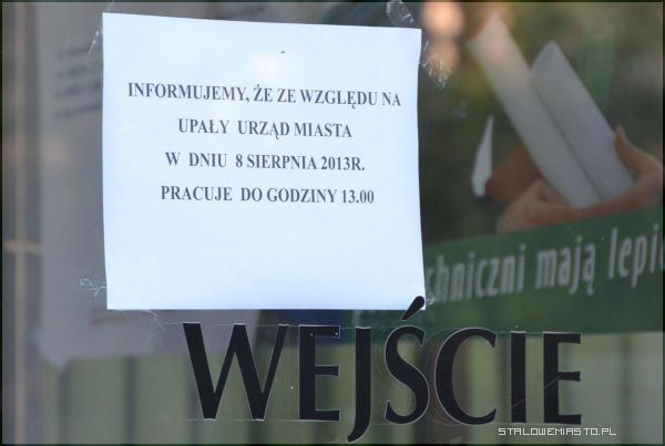 Urzędnicy mają gorzej, a w rezultacie lepiejByli również i tacy, którym cierpienia i katusze pracy zostały skrócone. Do grupy szczęśliwców należą pracownicy urzędu miasta, którzy np. 8 sierpnia wyszli z pracy o 2,5 godziny wcześniej. Jeśli ktoś chciał załatwić jakąś sprawę w urzędzie, odszedł z kwitkiem. Na drzwiach magistratu pojawiła się kartka z napisem: Informujemy, że ze względu na upał urząd miasta w dniu 8 sierpnia 2013 r. pracuje do godziny 13.00. W piątek 9 sierpnia temperatura będzie podobna do tej z czwartku, radzimy więc na wszelki wypadek załatwiać sprawy urzędowe do godz. 13.00.