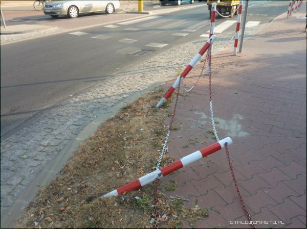 Słupki połączone łańcuchem stoją z czterech stron ronda. Oddzielają jezdnię od chodnika. Mają zapobiec wbieganiu pieszych i przekraczaniu ulic w niedozwolonych miejscach. Według niektórych ograniczają tylko widoczność i pogarszają bezpieczeństwo na drodze. To, że jest tam ciasno i trudno wyrobić na zakrętach, nie trzeba tłumaczyć. Dowodem na to jest fakt, że biało- czerwone pale zostały skoszone już kilkakrotnie i to z każdej strony. Trzeba było montować je od nowa.