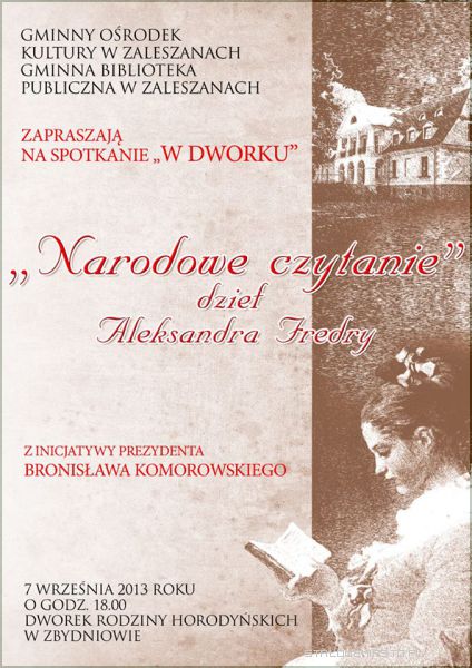 Już niebawem Fredro będzie pobrzmiewał w bibliotekach, na miejskich placach, rynkach, w domach pomocy społecznej. Usłyszymy go również w Zbydniowie w sobotę, 7 września w Dworku Rodziny Horodyńskich. Czytanie dzieł pisarza rozpocznie się o godz. 18.00. pod patronatem Gminnego Ośrodka Kultury i Gminnej Biblioteki Publicznej w Zaleszanach.
