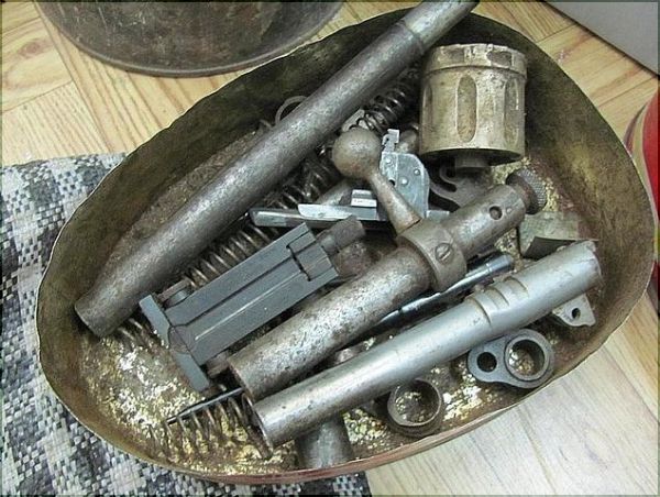 Przeszukując piwnicę śledczy odkryli pod posadzką specjalnie skonstruowaną skrytkę, która zasłonięta była metalową blachą. W niej znaleźli części broni palnej w postaci luf, zamków do karabinu, bębenka do rewolweru, iglicę, sprężyny i inne elementy broni. W skrytce znajdował się także proch strzelniczy, trzy załadowane amunicją magazynki, dwa wiaderka oraz tekturowe pudło z amunicją. Zabezpieczony arsenał policjanci zabrali do depozytu.