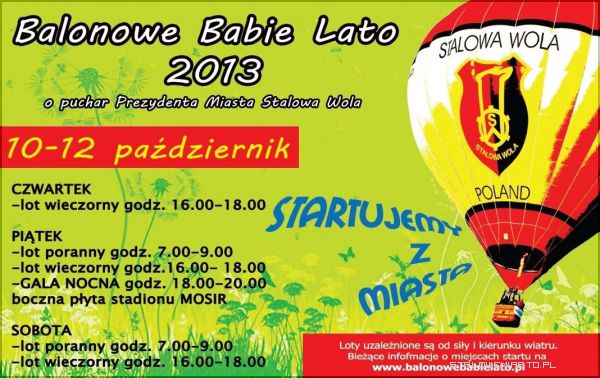 W dniach 10-12 października 2013 r. odbędzie się najbarwniejsza impreza lotnicza roku „Balonowe Babie Lato”. Już po raz kolejny nad Stalową Wolą uniosą się w niebo balony z całej Polski i nie tylko.