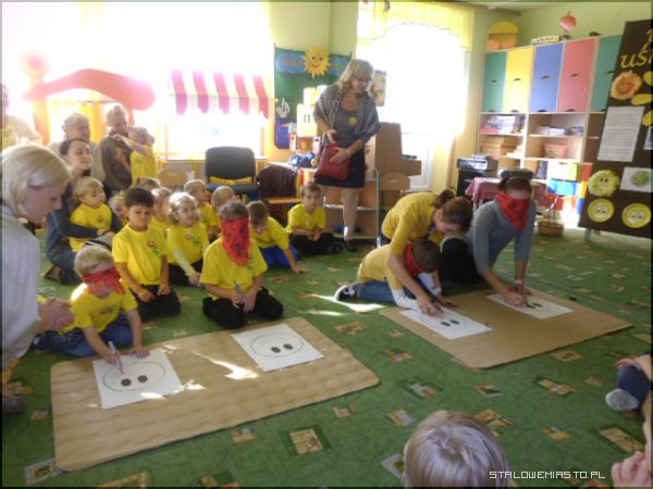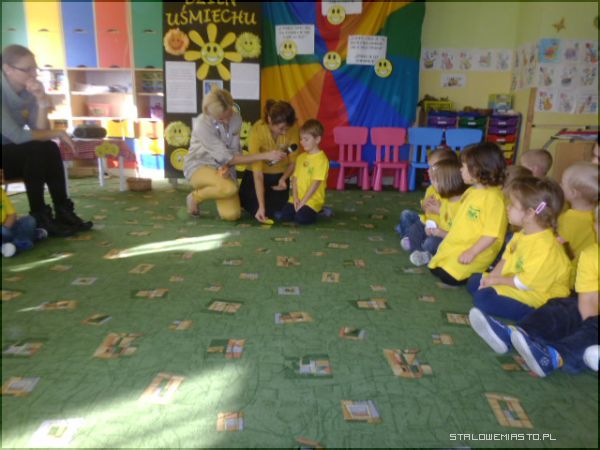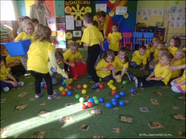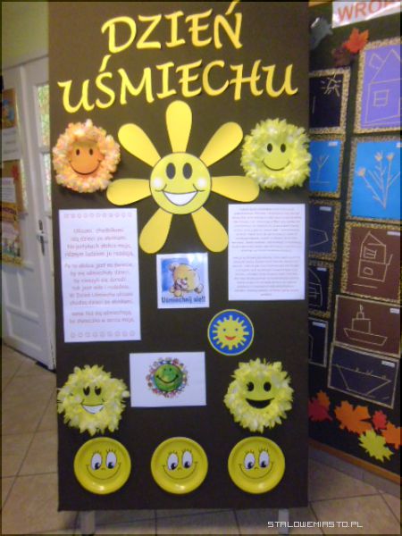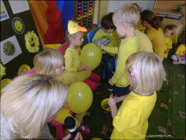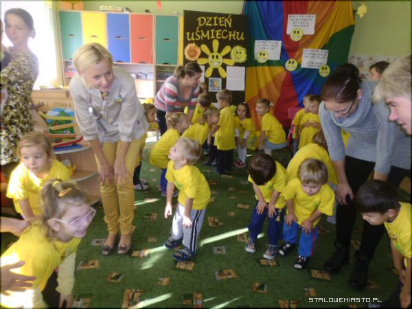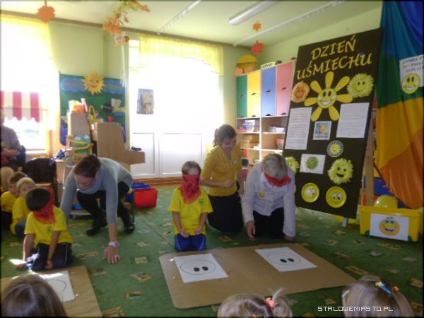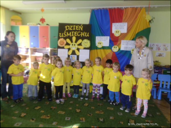 Specjalnie na ten dzień została przygotowana scenografia w sali; uśmiechnięte buźki, optymistyczne hasła i każdy ubrany był w „coś żółtego”, a przedszkolaki w żółte koszulki z logo przedszkola. Pani Anna Krasnowska i Anna Buczak - inicjatorki „Dnia Uśmiechu” w przedszkolu witały dzieci i dorosłych z uśmiechem i zapraszały do wspólnych zabaw.