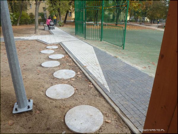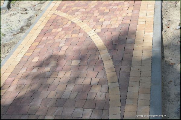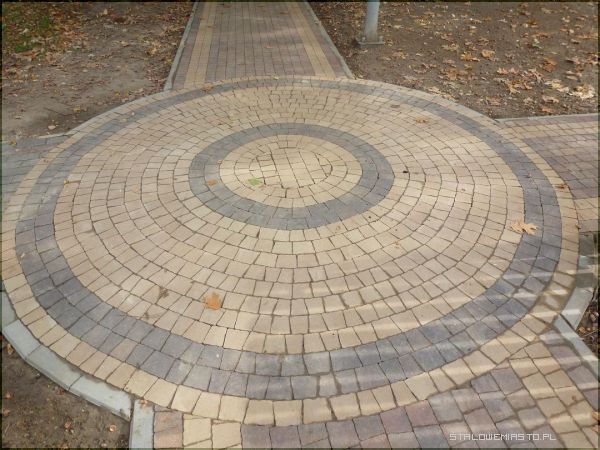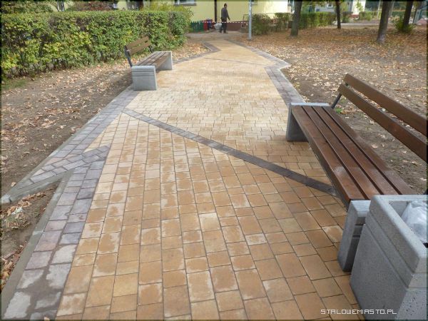 Faktura kostek, z których powstały chodniki jest bardzo zróżnicowana. W niektórych miejscach jest to ozdobna kostka brukowa, w innym miejscu jest to stonowany kawałek chodnika ułożony z szaro-granatowych kwadratów. Są też miejsca, gdzie kostka przeplata się różnymi kolorami m.in. pomarańczowymi, szarymi, piaskowymi, granatowymi itp. Na rozwidleniu dróg chodników pojawiają się jakby małe ronda z kolorowych kostek, co tworzy bardzo ciekawy efekt. Powstały też dróżki z okrągłych granitowych elementów, które bardzo do gustu przypadły dzieciom. Tego typu rozwiązania jakie zostały zastosowane, to prawdziwa rzadkością w naszym regionie.