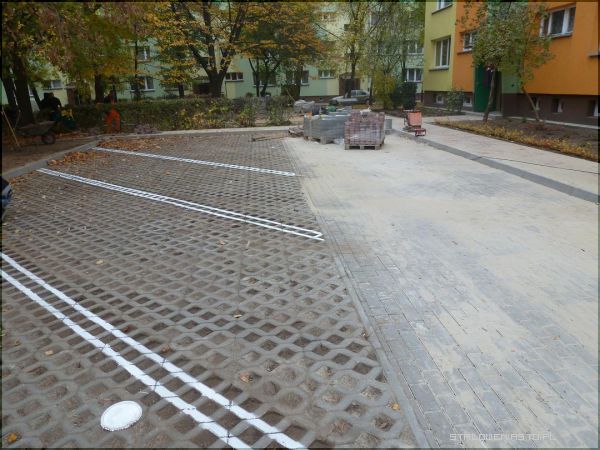Parking przed blokiem nr 6 jest po części wykonany z szarej kostki brukowej oraz płyt parkingowych, w środku których została posadzona trawa. Samochody będą tutaj parkowały na ukos.