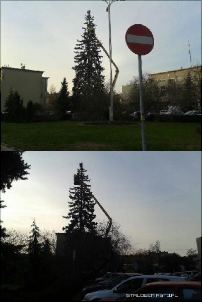 Ozdoby na choince rosnącej przed Urzędem Miasta ograniczają się do światełek, a te będą błyszczeć tylko na wyższych partiach drzewa. Do takiego widoku przyzwyczajeni są już mieszkańcy, bo tak jest od lat. Obserwując robotników niektórzy żartownisie zasugerowali, żeby panowie, którzy uwijają się przy montażu oświetlenia rozważyli pozostanie na choince. W jaskrawo- żółtych kamizelkach mogliby przecież uchodzić za dodatkowy element dekoracji, tak bardzo zubożonego miejskiego drzewka...