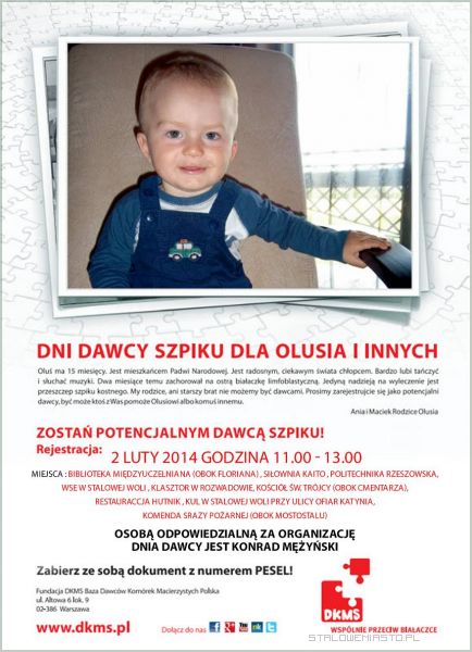 2 lutego w Stalowej Woli odbędzie się Dzień Dawcy Szpiku. Poszukujemy dawcy dla 14- miesięcznego Olusia. Będzie to jak dotychczas największa tego typu akcja zorganizowana w Stalowej Woli.