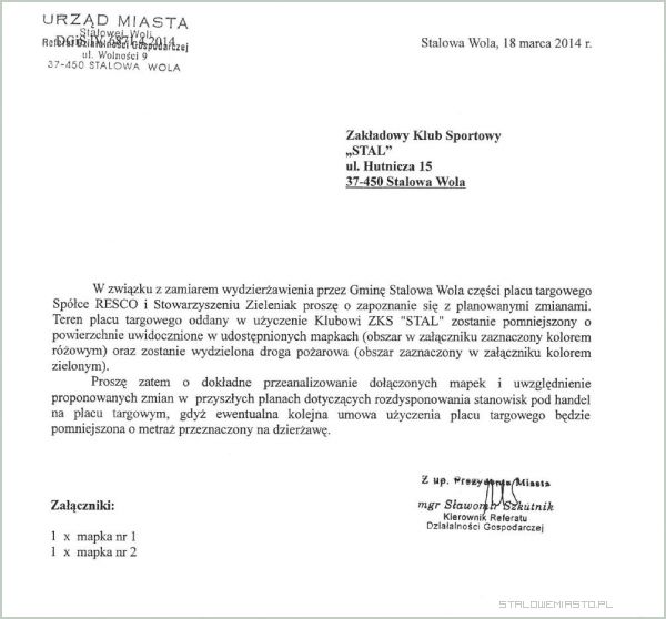 Pismo do ZKS Stal Stalowa Wola