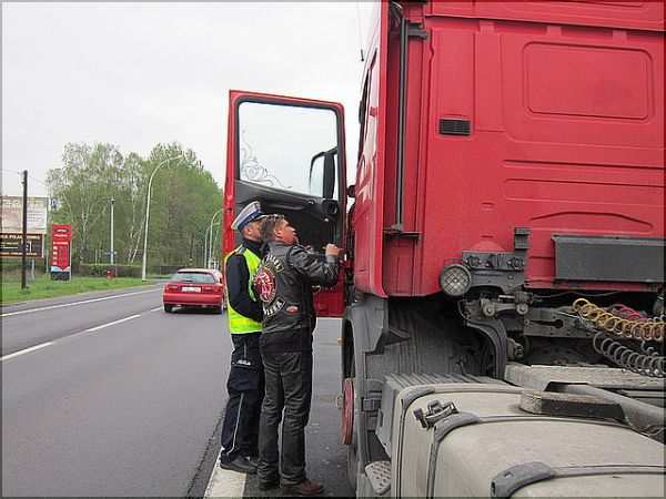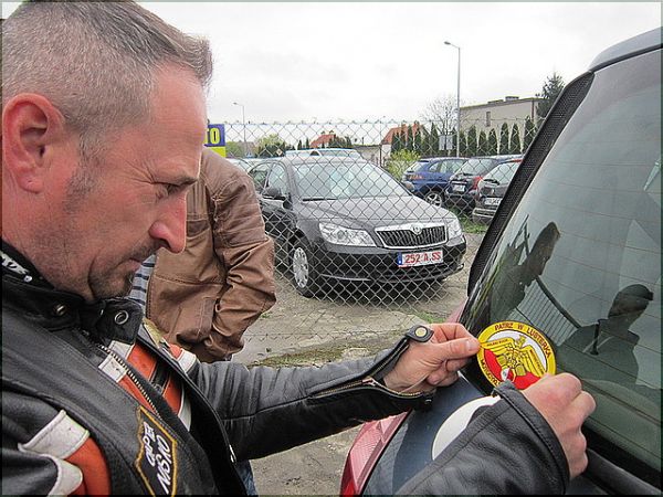 Przedstawiciele klubów motocyklowych zrzeszonych w Polskim Ruchu Motocyklowym za zgodą zatrzymanych do kontroli kierowców, we wskazanych przez nich miejscach naklejali na samochody specjalne naklejki z hasłem: „Patrz w lusterka – motocykle są wszędzie”.