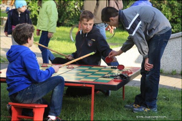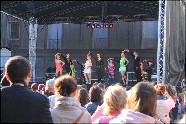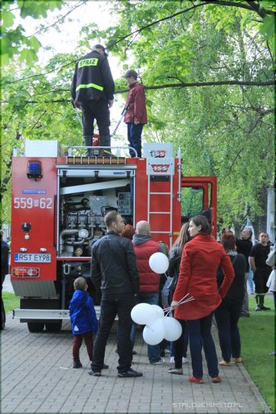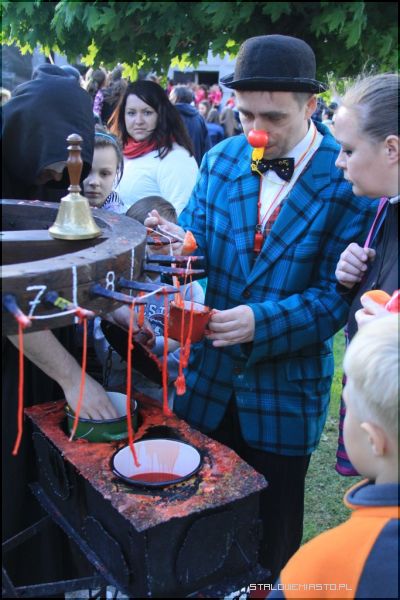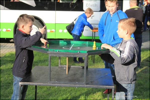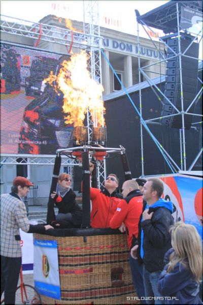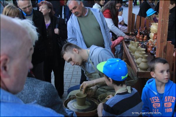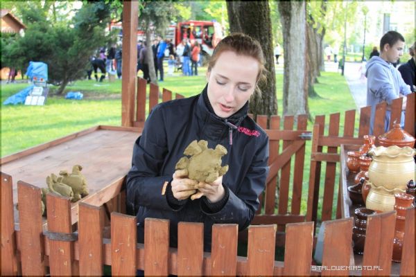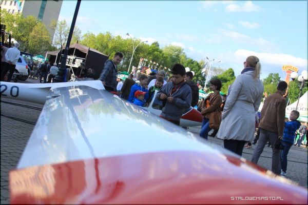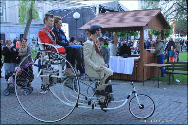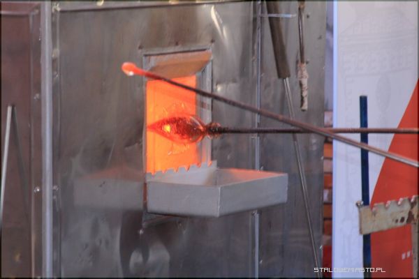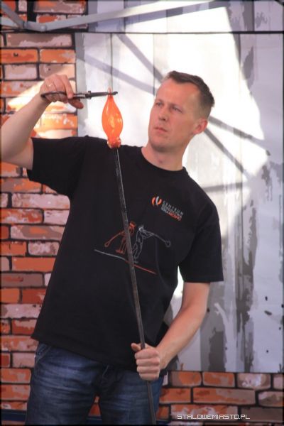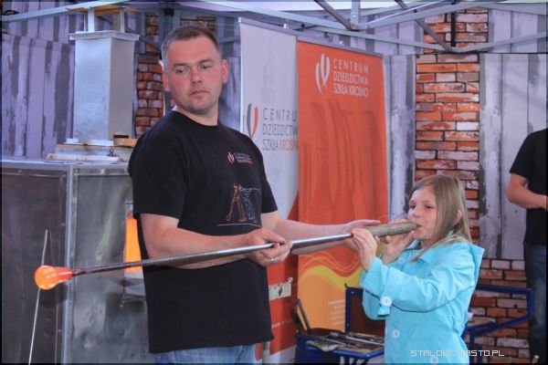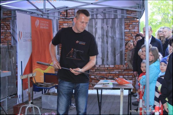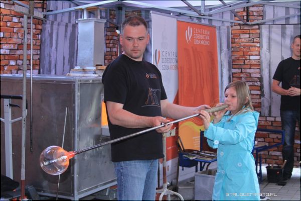 To projekt Centrum Dziedzictwa Szkła z Krosna - gdzie działa najsłynniejsza na Podkarpaciu huta szkła. Na organizowanie takich pokazów pozwala przewoźny, niewielkich rozmiarów piec hutniczy. Rzemieślnicy wyrabiali prawdzie cacka na oczach publiczności. Na przykład w dosłownie 10 minut zrobili słynną rybkę - słynną z poprzedniej epoce, bo upstrzona kolorowymi mazajami rybka różnych rozmiarów stała chyba w każdym mieszkaniu - na regale czy telewizorze. Czy trudno wydmuchuje się kształty z rozgrzanego szkła? O tym mógł przekonać się każdy chętny. Niektóre wyroby można było kupić. Atrakcji tego dnia na placu przed i obok MDK-u było oczywiście więcej. Szczęśliwie pogoda nieco się zlitowała nad organizatorami i widzów było więcej niż w sobotę. Wspomnijmy, że dziś prezentowana była moda rowerowa sprzed dwóch wieków. I na takich wiekowych bicyklach przejeżdżali się potem po placu modele i modelki. Chociaż pojazdów różnej maści i różnym napędzie było znacznie więcej: od wozów strażackich, przez szybowiec i balon.