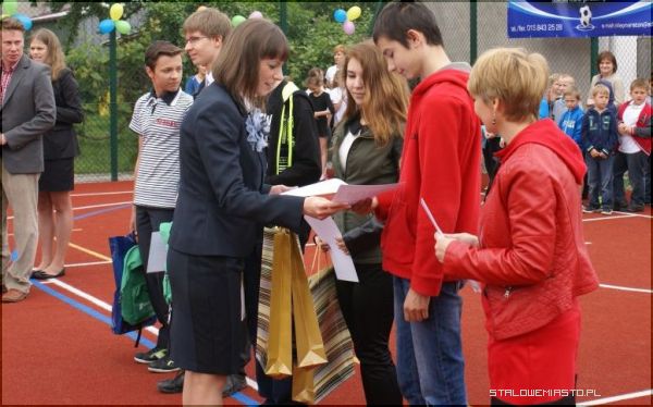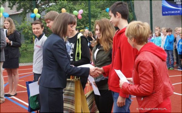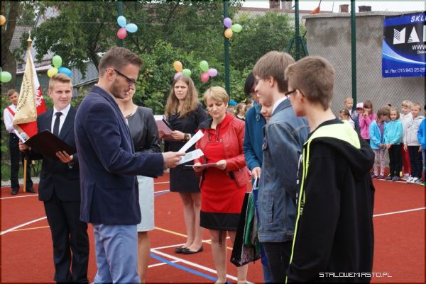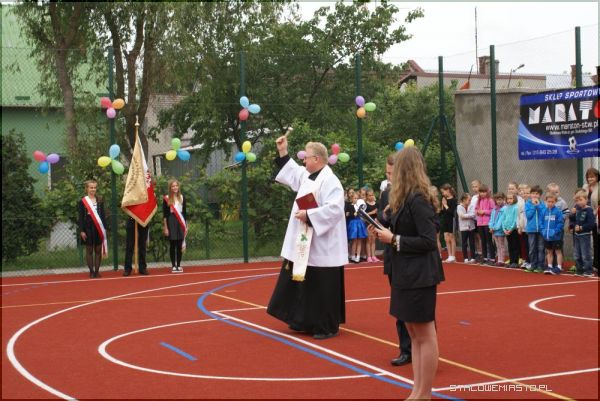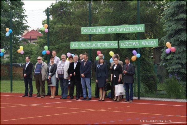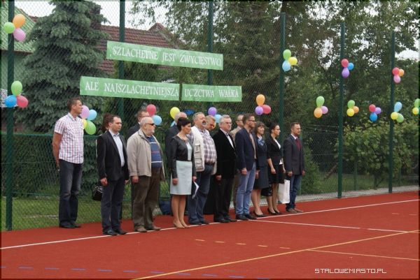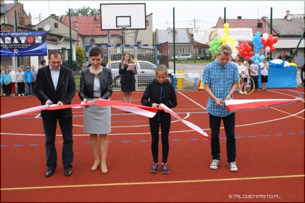 Wstęgę przecieli: dyrektor szkoły Lucyna Żminda, przedstawiciele uczniów oraz szef kancelarii prezydenta Andrzej Dorosz. Nowe boisko wielofunkcyjne zostało także poświęcone przez ks. Jana Folcika.