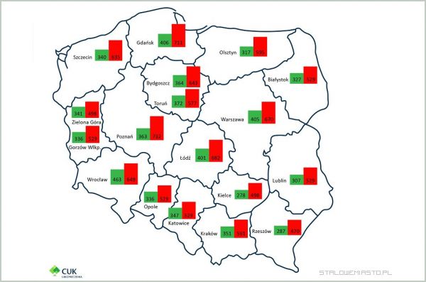 Biorąc pod uwagę stolicę województw można stwierdzić, że tańsze OC jest tylko w Kielcach (woj. świętokrzyskie) gdzie cena OC waha się od 278 zł do 498 zł. Rzeszów jest drugim najtańszym miastem wojewódzkim pod względem składek za OC za samochód. Najdrożej jest w takich miastach jak: Gdańsk (od 406 zł do 711 zł), Wrocław (od 463 zł do 649 zł), Warszawa (od 405 do 670 zł).