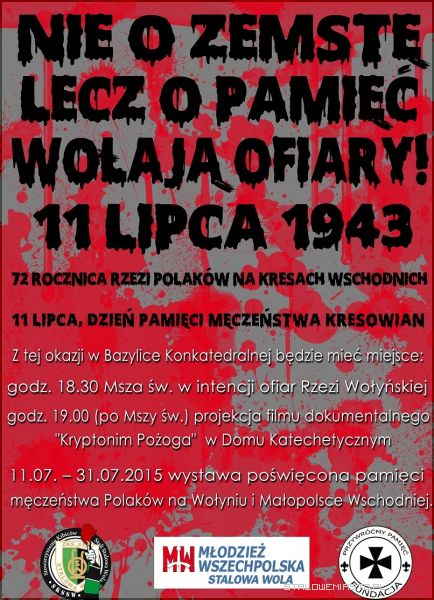 A jeszcze dziś o godz. 18.30 odbyła się Msza św. w intencji ofiar rzezi wołyńskiej w kościele p.w. Matki Bożej Królowej Polski. O godz. 19.00 (po Mszy św.) będzie mieć miejsce projekcja filmu dokumentalnego w Domu Katechetycznym pt. „Kryptonim Pożoga”...