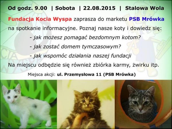 - Chętnych do głaskania naszych kotów zapraszamy od 9.00 (Sobota, 22.08.), PSB Mrówka, ul. Przemysłowa 11- czytany na profilu fb Kocia Wyspa.