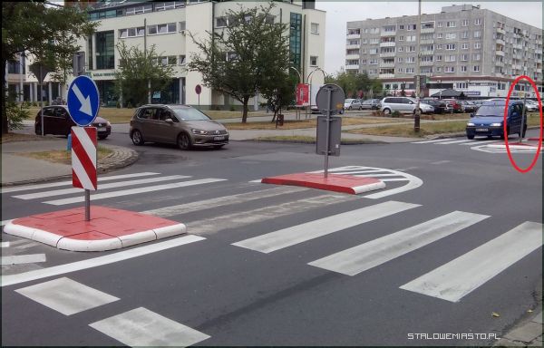 Teraz wreszcie nie ma obowiązku zatrzymywać się jak na pierwsze przejście (bo dzięki wysepce to są dwa niezależne przejścia) wchodzi pieszy. Można jechać dalej. A pieszy poczeka zasłonięty za znakiem Fajnie wyrysowane części wyłączone z ruchu - heh nawet radiowozy najeżdżają na nie przy skręcaniu
