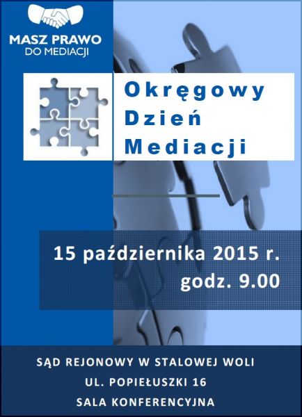 15 października o godz. 9.00 w sali konferencyjnej Sądu Rejonowego w St. Woli przy ul. Popiełuszki 16 będzie miał miejsce Okręgowy Dzień Mediacji.