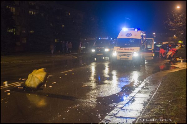 Sprawcą wypadku był 31- letni mieszkaniec Stalowej Woli. Z relacji świadków wynika, że mężczyzna jechał bardzo szybko ulicą Poniatowskiego, od strony Rozwadowa, gdy starsza kobieta przechodziła przez pasy (od strony Społem w kierunku bloku Poniatowskiego nr 11, przeszła około 2/3 pasów, do chodnika pozostał jej około 1-1,5 m). 78- latka do czasu przybycia karetki leżała na jezdni, w kałuży wody. Padał deszcz, a poszkodowana uskarżała się na silny ból. Uderzenie pędzącego samochodu spowodowało, że jej ciało przemieściło się aż o kilka metrów od przejścia dla pieszych.