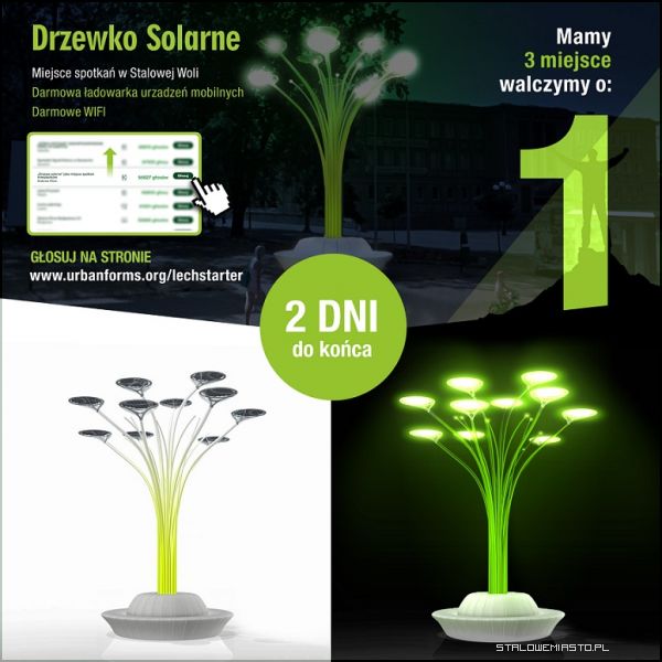 Zaledwie kilkadziesiąt godzin dzieli Stalową Wole od wygrania grantu na realizację projektu drzewka solarnego dla Stalowej Woli. Aktualnie jesteśmy na trzecim, premiowanym miejscu, ale ostateczna batalia o pięć pierwszych miejsc rozegra się przez najbliższy weekend. Zadecydują głosy oddane w ostatniej chwili.