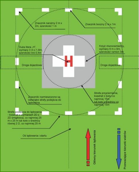 Samo lądowisko nie musi być duże (płyta minimalnie ma mieć wymiary 25X25 m). Tutaj chodzi raczej o strefę podejścia do lądowania. Maszyna musi mieć miejsce, by bezpiecznie dostać się nad płytę, po drodze nie zaczepiając o bloki mieszkalne czy inne okoliczne budynki. Do miejsca lądowania musi prowadzić droga dojazdowa. Przeszkody usytuowane na osi lądowania i startu nie mogą być wyższe niż wynika to z granicznej płaszczyzny o nachyleniu 1:6 w stosunku do poziomu lądowiska. Na przykład gdy odległość przeszkody od strefy podejścia do lądowania i startu wynosi 600 metrów, maksymalna wysokość przeszkody ponad poziom lądowania może wynieść 100 metrów.
