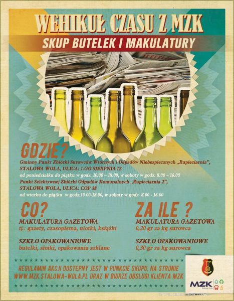 Regulamin akcji dostępny jest w punktach skupu, na stronie www.mzk.stalowa-wola.pl oraz w Biurze Obsługi Klienta MZK. Telefon kontaktowy do Punktów Skupu w Stalowej Woli ul. 1-go Sierpnia 18A (Rupieciarnia) 15 642 62 36, ul. COP 38 (Rupieciarnia 2) 15 810 93 30 wew.32.