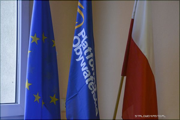 Obywatelska postawa z flagą UE i PO w tle.