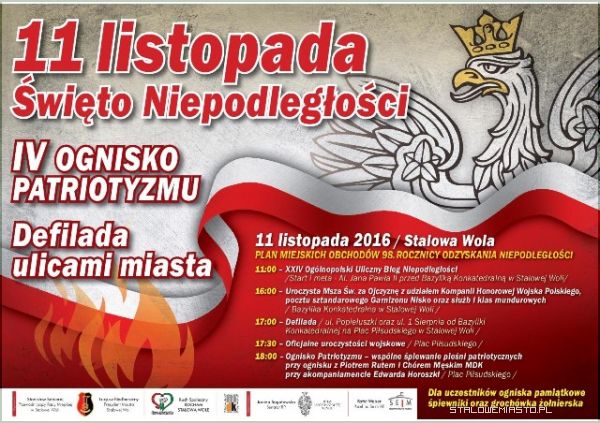 Popołudniowe obchody natomiast rozpoczną się o godzinie 16.00 uroczystą Mszą Św. za Ojczyznę z udziałem Kompanii Honorowej Wojska Polskiego, pocztu sztandarowego Garnizonu Nisko oraz służb, klas mundurowych, Strzelców i harcerzy, która odbędzie się w Bazylice Konkatedralnej w Stalowej Woli.