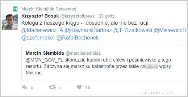 „skończcie k…a robić chlew i pośmiewisko z tego resortu. Zaczyna się marsz ku katastrofie przez takie ch….e wpisy. Myślcie” (wulgaryzmy wykropkowaliśmy, w oryginale na Twitterze są napisane w całości).