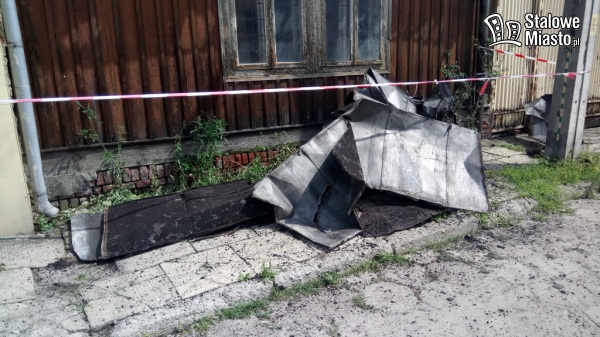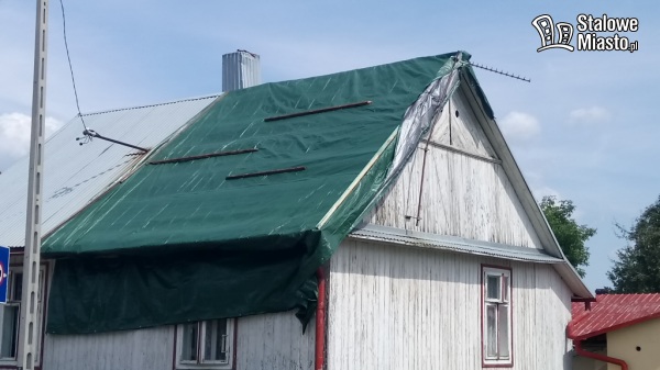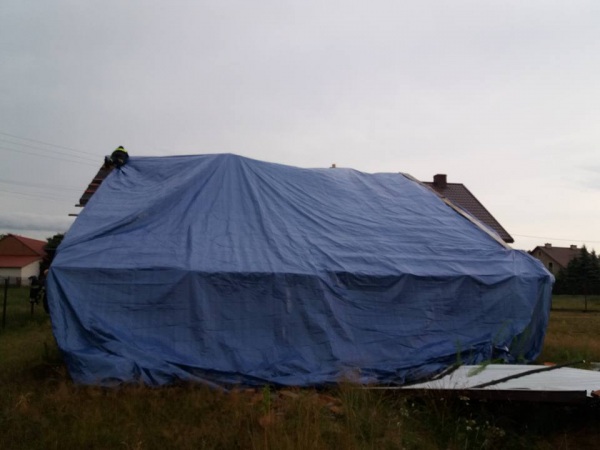 Na ul. Kochanowskiego został zerwany dach blaszany o powierzchni ok 25 m2 na niezamieszkałym domu jednorodzinnym. Działania strażaków polegały na zabezpieczeniu budynku przy pomocy plandeki.